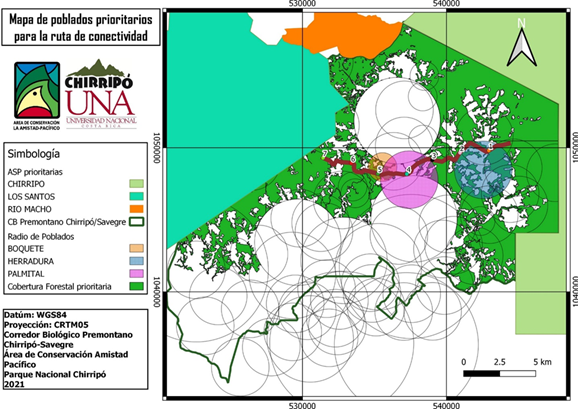 ABSTRACT. “Structural connectivity between priority conservation areas of the Chirripó-Savegre Premontane Biological Corridor, Costa Rica”. Introduction: Structural forest connectivity in biological corridors defines degree to which landscape facilitates, or prevents, movement between resource patches. However, there is insufficient information on this subject for the Chirripó-Savegre area. Objective: To evaluate structural connectivity of the possible link route between priority conservation areas of the Chirripó-Savegre Premontane Biological Corridor, Costa Rica. Methods: We defined the protected wild areas to be connected; identified priority connection nodes or nuclei (forest patches); defined the obstacles (roads, villages and soils devoid of vegetation), estimated distance to water bodies protected by law; and modeled the connectivity route. Results: The structural connectivity route runs between the contour lines on 1,600 and 2,100 meters above sea level, with six intervention points (wildlife crossings, reforestation or natural regeneration). Conclusion: A structural connectivity route can be developed in the Chirripó-Savegre corridor.