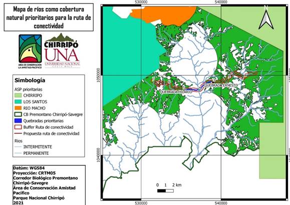 Para priorizar la ruta de conectividad estructural en el sector más desprovista de vegetación se utilizan los ríos como cobertura natural y se determina que en el sector de Palmital se encuentran dos afluentes que interconectan los nodos de la cobertura forestal prioritarios, siendo la quebrada Hilario con la quebrada Ernesto las que se determinan como posibles conectores de la ruta y además es el sector donde mayor reforestación o regeneración natural se debe realizar (Fig. 3).