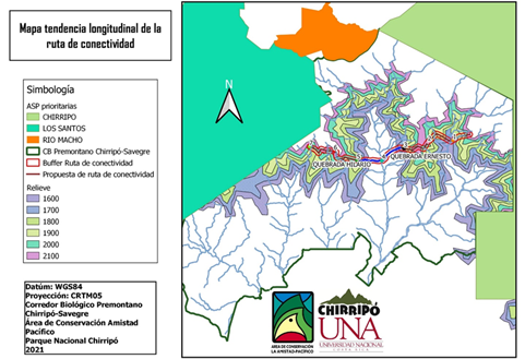 Se obtuvo una ruta de conectividad longitudinal debido a que une una misma región altitudinal (Puebla et al., 2020), que va desde los 1 500 a los 2 100 metros sobre el nivel del mar enlazando las Áreas Silvestres protegidas; Parque Nacional Chirripó con Reserva Forestal Los Santos, según el estudio de elevación con las capas de Relieve del Atlas Costa Rica 2014 (Ortiz-Malavasi, 2014).