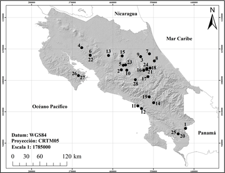 Área de estudio y muestreo: Se analizaron 484 individuos de 76 muestras en alcohol correspondientes a 28 sitios de muestreo, distribuidas en la totalidad de provincias de Costa Rica, permitiendo tener una amplia representación de la distribución geográfica del género (el detalle de cada fecha de recolecta, nombre del cuerpo de agua, provincia, recolector, individuos analizados, elevación, orden del río, y coordenadas está disponible en Sibaja-Araya, 2020. Estas muestras se seleccionaron en el proyecto "Estudio Preliminar de la Ecología y Diversidad del Orden Ephemeroptera en Costa Rica" (código SIA 0230–13), a partir de las colecciones de insectos acuáticos del Laboratorio de Entomología de la Escuela de Ciencias Biológicas (LEUNA), Museo de Zoología (UNA), y la colección de macroinvertebrados acuáticos del Instituto Regional de Estudios en Sustancias Tóxicas (IRET-UNA). Su selección se realizó con base en los siguientes criterios: a) representación de áreas urbanas, rurales y boscosas; b) periodo de colecta de la muestra entre 2014–2017, favoreciendo el estado de conservación del material taxonómico y características ambientales recientes; c) rango altitudinal variado (14 a 1762msnm); y, d) diversas zonas geográficas del país como las regiones Brunca, Central, Chorotega, Huetar Atlántica, Huetar Norte, y Pacífico Central (Fig. 1).