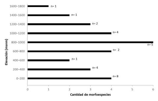 Fig.8.Cantidad de morfoespecies registradas cada 200 metros en el gradiente altitudinal del material revisado, con “n” como cantidad de sitios de muestreo.