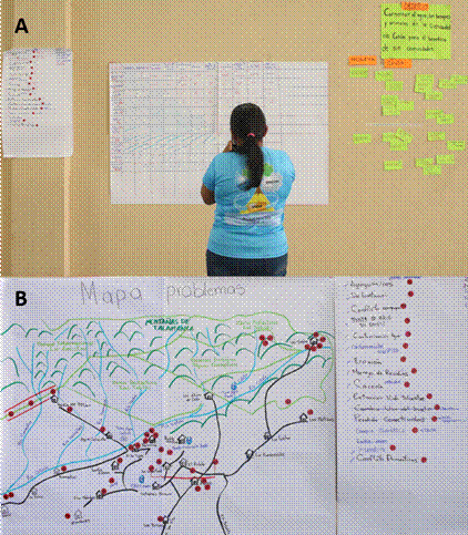 Fig. 2. Identificación, priorización (A) y mapeo (B) de las amenazas de la cuenca del río Cotón y la Zona Protectora Las Tablas y Reserva Biológica del Bicentenario de la República - Pájaro Campana a través de estrategias participativas.