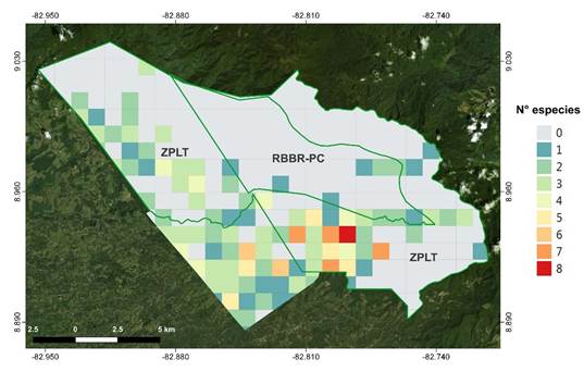 Los registros obtenidos con ambos enfoques de investigación fueron procesados en el programa QGIS (2021). Para esto, se generaron celdas de 1 km y con la herramienta “contar puntos en polígonos” se sumaron todas las especies amenazadas registradas por celda como un proxy de la riqueza de especies amenazadas. Con esto se buscó identificar las celdas dentro de las áreas protegidas (ZPLT y RBBR-PC) y su zona de amortiguamiento con la mayor cantidad de especies amenazadas y las implicaciones que esto tiene para la planificación de la conservación.