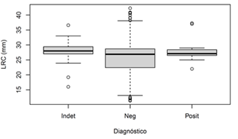 Fig. 1. Distribución de los valores de longitud rostro-cloacal (LRC) (mm) en individuos de Atelopus varius positivos para Batrachochytrium dendrobatidis , negativos e indeterminados (el análisis de ADN no resultó correctamente).
