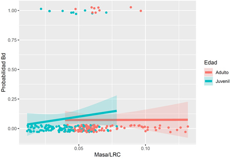 La prevalencia de los adultos es mayor a la de los juveniles, sin embargo, la probabilidad de infección parece tender a ser mayor en los subadultos con relación masa/LRC similar a algunos adultos. Esto podría sugerir que el Batrachochytrium dendrobatidis no causa una mortalidad alta en los adultos infectados. Por otro lado, los juveniles, pese a tener una prevalencia menor en general, tiende a una relación positiva con la relación masa/LRC, por lo que parece que el grupo de edad más afectado por Batrachochytrium dendrobatidis en esta población serían los subadultos o juveniles de mayor tamaño, causando un reclutamiento bajo de adultos, como se presentó en la evaluación poblacional llevada a cabo en 2016 (Seisdedos-de-Vergara, 2017).