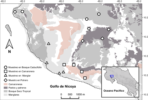 Área de Estudio: El estudio se desarrolló entre julio del 2018 y enero del 2019, en una matriz mixta de bosques de mangle y bosque tropical seco, intervenida por áreas transformadas para desarrollo de actividades humanas de carácter productivo. El área de interés abarca desde la desembocadura del río Tempisque en la zona interna del Golfo de Nicoya, hasta la zona terrestre en el costado oeste del río; en inmediaciones de la localidad de Níspero de Cañas, Guanacaste, Costa Rica (Fig. 1). Se caracteriza por tener una gran variedad de flora y fauna producto de la diversidad de ecosistemas predominantes como manglares, bosque seco tropical y bosque seco tropical en transición a bosque subhúmedo, ríos y esteros que allí se encuentran. La región presenta elevación máxima de 70 m.s.n.m., temperatura media anual de 27,67°C y una precipitación media anual de 1 544mm.