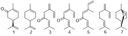 In Costa Rica, there are two natural chemotypes: one is called sweet form, defined by the presence of high levels of the cyclic monoterpenoids carvone (1) and limonene (2), and the other one is called strong form, characterized by the presence of the acyclic polyunsaturated monoterpenoids myrcenone (3), (Z)-ocimenone (4), (E)-ocimenone (5), myrcene (6), and the cyclic compound 1,8-cineole (7), as main constituents (Cicció & Ocampo, 2004; Ricciardi et al., 2009) (see numbered chemical structures in Fig. 1). The biogeographical situation of Costa Rica serves as a land bridge between North and South America. The sweet form probably came from South America (occurs in Colombia, Venezuela, and Brazil) and the strong form probably came to Costa Rica from Mexico and Guatemala.