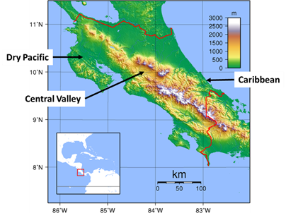 Fig. 2. Topographic map of Costa Rica. From “Costa Rica Topography.png,” by Sadalmelik. (2007, September 16). Wikimedia Commons (https://commons.wikimedia.org/wiki/file:Costa_Rica_Topography.png). In the public domain.