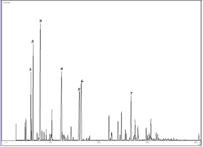 Fig. 3. GC-MS chromatogram (TIC) of Mexican Lippia alba essential oil [1. sabinene; 2. myrcene; 3. 1,8-cineole; 4. myrcenone; 5. (Z)-ocimenone; 6. (E)-ocimenone; 7. germacrene D].