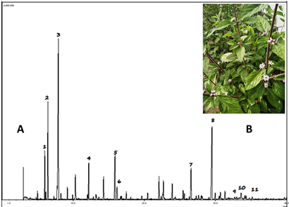 Fig. 4. A. GC-MS chromatogram (TIC) of Costa Rican Lippia alba essential oil [1. sabinene; 2. myrcene; 3. 1,8-cineole; 4. myrcenone; 5. (Z)-ocimenone; 6. (E)-ocimenone; 7. germacrene D; 8. hedycaryol; 9. γ-eudesmol; 10. β-eudesmol; 11. α-eudesmol]. B. Blooming strong form (Photography by J. F. Cicció)