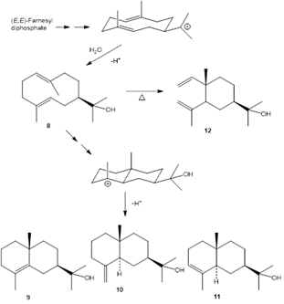 Fig. 5. Formation of hedycaryol 8, γ-eudesmol 9, β-eudesmol 10, α-eudesmol 11, and elemol 12. (Cornwell et al., 2000).