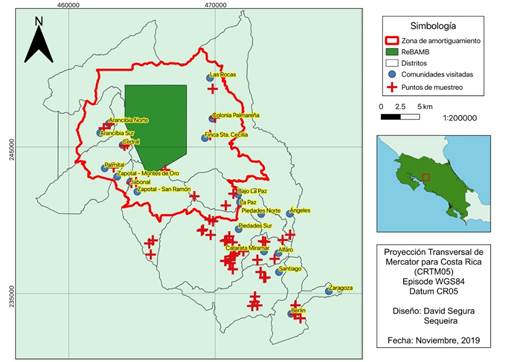Área de Estudio: La investigación la desarrollamos en 59 propiedades en la zona de amortiguamiento y cercanías de la Reserva Biológica Alberto Manuel Brenes (ZA-ReBAMB). Las propiedades están ubicadas en los distritos de Alfaro, Ángeles, Piedades Norte, Piedades Sur, San Rafael (Berlín) y Santiago en San Ramón, Alajuela; Arancibia de Puntarenas; Unión de Montes de Oro y Zapotal y Zaragoza de Palmares. Catorce de las propiedades estudiadas forman parte de la ZA-ReBAMB delimitada (Moya & Brenes, 2017), varias de las demás están a menos de 15km de distancia, aunque algunas están más alejadas como Zaragoza de Palmares que está a 40km aproximadamente (Fig. 1). Escogimos propiedades en donde se dieron conflictos y luego según lo que deparó la técnica de bola de nieve. Se debe tomar en cuenta que la actual ZA-ReBAMB es una delimitación teórica y las áreas donde se encuentran las propiedades de este estudio podrían estar incluidas en ella ya que son de influencia directa en la reserva. Debido a este factor tratamos a las propiedades del estudio como parte de la ZA-ReBAMB y así nos referiremos a ellas a lo largo de este trabajo.