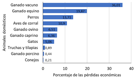 Fig. 2. Porcentaje de las pérdidas económicas representado por cada tipo de animal doméstico del total estimado producto de la depredación de fauna silvestre durante el periodo 2000-2018 en la zona de amortiguamiento de la Reserva Biológica Alberto Manuel Brenes, Costa Rica.