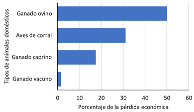 Fig. 12. Porcentaje de pérdida económica según el tipo de animal doméstico por depredadores desconocidos durante el periodo 2000-2018 en la zona de amortiguamiento de la Reserva Biológica Alberto Manuel Brenes, Costa Rica.