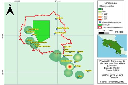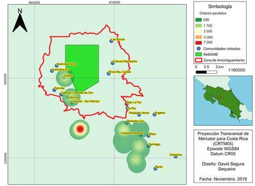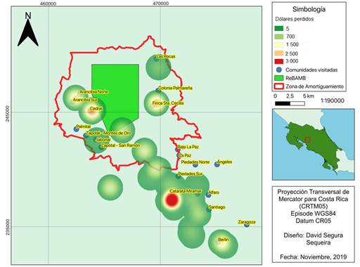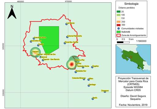 Fig. 4. Puntos calientes de pérdidas económicas por depredación por el coyote (Canis latrans) durante el periodo 2000-2018 en la zona de amortiguamiento de la Reserva Biológica Alberto Manuel Brenes, Costa Rica.