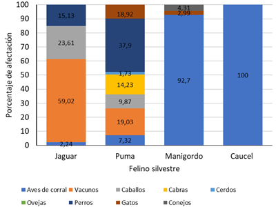 Fig. 5. Porcentaje de la pérdida económica por tipo de animal afectado, causada por cada uno de los felinos silvestres durante el periodo 2000-2018 en la zona de amortiguamiento de la Reserva Biológica Alberto Manuel Brenes, Costa Rica.