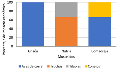 Fig. 7. Porcentaje de la pérdida económica por tipo de animal afectado causada por mustélidos durante el periodo 2000-2018 en la zona de amortiguamiento de la Reserva Biológica Alberto Manuel Brenes, Costa Rica.
