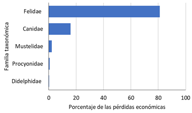 Fig. 9. Porcentaje de pérdida económica debido al ataque de mamíferos, según familias taxonómicas, sobre animales domésticos durante el periodo 2000-2018 en la zona de amortiguamiento de la Reserva Biológica Alberto Manuel Brenes, Costa Rica.