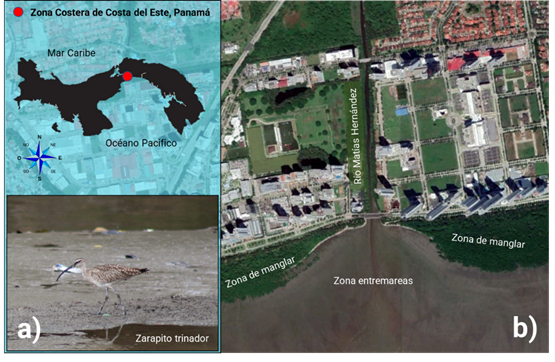 El área de estudio está ubicada en Costa del Este (09°00’35.34’’ N, 79°28’04.93” W), en el litoral Pacífico, corregimiento de Juan Díaz, distrito de Panamá. El área costera consta de una zona de entremareas (zona rocosa, de arena y fangosa), la desembocadura del río Matías Hernández, zona de manglares que están representados por pequeños islotes de mangle blanco (Laguncularia racemosa) y mangle negro (Avicennia germinans) y un muro de concreto que separa los fangales de las urbanizaciones. Durante la bajamar queda expuesta una vasta extensión de fangales rodeados por gran cantidad de desechos de distintas denominaciones (Fig. 1b).