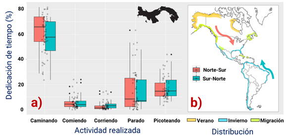 Fig.2. Comportamiento alimentario de Numenius phaeopus; a. Actividades alimentarias realizadas durante los dos periodos de migración en la zona Costera de Costa del Este, Panamá; b. Distribución y rutas migratorias de Numenius phaeopus en América.