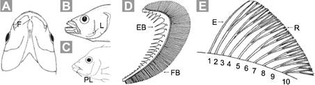 Fig. 2. Anatomía externa generalizada de miembros de la familia Cichlidae. (A) Vista ventral de la región cefálica (cabeza) de un miembro del género Cribroheros mostrando el pliegue del labio discontinuo, i.e. con una separación (frenillo) en la porción media y anterior. (B) Vista lateral de la cabeza de un miembro del género Parachromis mostrando el lóbulo o extensión angular en el preopérculo; L: Lóbulo. (C) Vista lateral de la especie Cribroheros altifrons mostrando el lóbulo lateral del labio inferior izquierdo prolongado o expandido ventralmente. (D) Arco branquial; EB: Espina branquial; FB: Filamento branquial. (E) Elementos óseos de la aleta dorsal y método de conteo; E: Espinas; R: Radios.