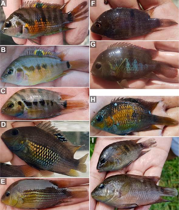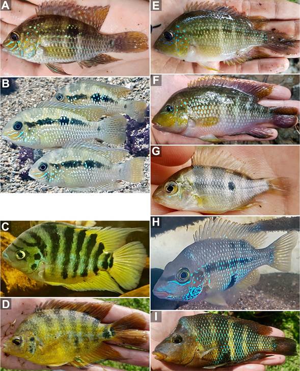 Fig. 5. Especies de Cichlidae de Costa Rica. (A-C) Amatitlania kanna; A-B: hembra; C: macho. (D-E) Amatitlania myrnae; D: hembra, E: macho. (F-G) Amatitlania sajica; F: hembra, G: macho. (H-I) Amatitlania septemfasciata; H: hembra; I: arriba hembra, abajo macho.