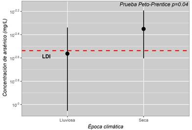 Análisis estadístico: El análisis de datos se realizó con el método no paramétrico de supervivencia con la técnica estimación de máxima verosimilitud y análisis descriptivos de las estimaciones. La elección de la técnica se determinó según el tamaño de conjunto de datos y la proporción de valores censurados (valores por debajo del límite de detección) (Quitanilla, 2017). Todos los análisis fueron realizados con el paquete NADA (https://cran.r-project.org/web/packages/NADA/index.html) del lenguaje de programación R de CRAN (Helsel, 2012). Para el estudio se establecieron dos grupos de análisis: puntos de muestreo (alto, medio y bajo) y época climática (seca y lluviosa). Las diferencias entre grupos se analizaron con el método no paramétrico de Peto-Prentice con un nivel de significancia de p<0,05. Posteriormente, se construyó un gráfico de intervalos de la concentración de arsénico para cada grupo de análisis con el límite de detección, la media, el límite superior y límite inferior de las concentraciones estimadas mediante el análisis de datos censurados.