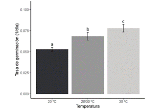 Fig. 1. Tasa de germinación promedio (± desviación estándar) de semillas de Myroxylon balsamum por temperatura. Letras distintas indican diferencias significativas según la prueba de Tukey (P < 0,05). Elaborada con datos de Aguilar-Sandí (2021).