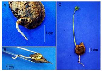 Se detectó aparición de hongos en todas las muestras desde el inicio de la prueba, pero la proliferación se controló satisfactoriamente aplicando Amistar al 0,1%. Además, la presencia del pericarpo no impidió que sucediera el proceso de imbibición; tampoco obstaculizó la emergencia de la radícula (Fig. 2A), la elongación del epicótilo (Fig. 2B), ni el desarrollo de la plántula (Fig. 2C).