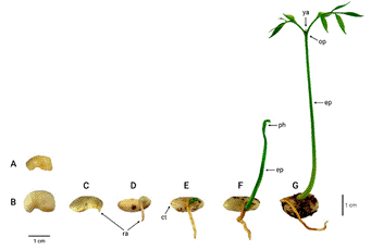 Germinación y desarrollo de la plántula: La germinación es hipogea y criptocotilar. Los cotiledones son blancuzcos y aumentan de volumen al absorber agua (Fig. 3A, B). En semillas incubadas a 30ºC, la radícula emerge a los 10 o 12 días (Fig. 3C, D). El epicótilo es fotosintético y se elonga rápidamente (Fig. 3E, F). No es posible observar el hipocótilo macroscópicamente.