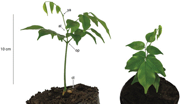 Abreviaturas― ct: cotiledones; ep: epicótilo; ph: primeras hojas; op: filotaxia opuesta; ra: radícula; ya: yema apical. [Texto y figura tomados de Aguilar-Sandí (2021, p. 38), CC BY-NC-ND 4.0]