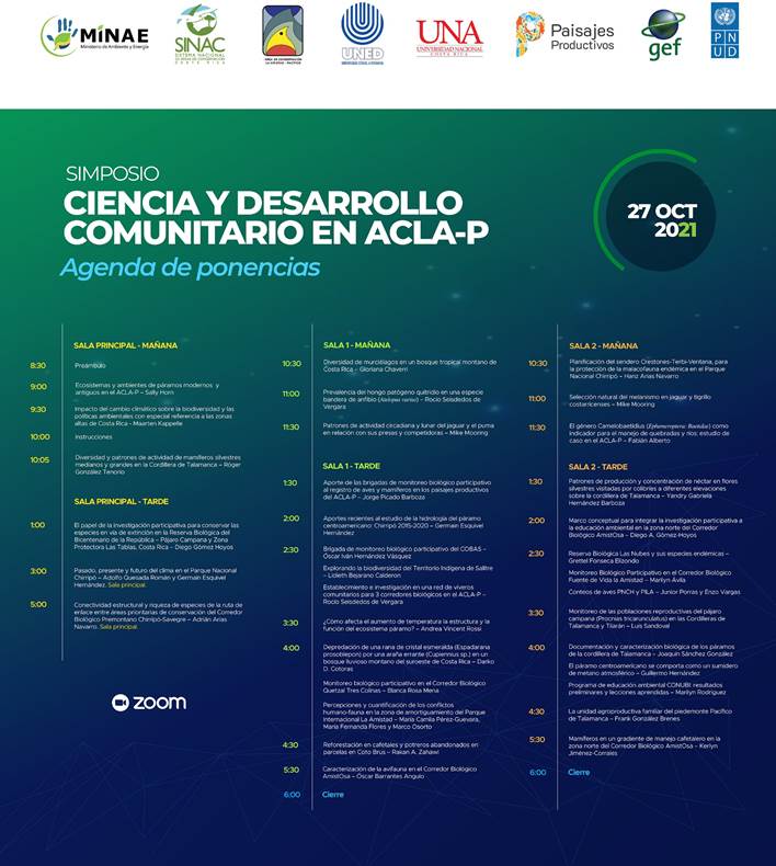 El Simposio Ciencia y Desarrollo Comunitario del ACLAP, fue un evento organizado en conjunto con el Proyecto Paisajes Productivos del Programa de las Naciones Unidas para el Desarrollo (PNUD), la Universidad Estatal a Distancia (UNED) y la Universidad Nacional de Costa Rica (UNA). Este simposio constituyó una puerta para la divulgación de los estudios científicos que se han realizado en la región, tanto hacia la comunidad científica como hacia el público general, con el fin de poner el conocimiento y la ciencia al servicio del desarrollo sostenible de las comunidades locales y contribuir a la resolución de los retos ambientales actuales. A continuación, los objetivos divulgados en la convocatoria de ponencias: