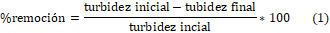 Determinación de la eficiencia: A partir de los datos obtenidos de turbidez, se calculó la eficiencia de remoción de los tratamientos, expresada en porcentajes de remoción, para ello se empleó la ecuación 1: