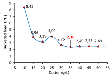 Fig. 3. Determinación de dosis óptima del sulfato de aluminio (T1)