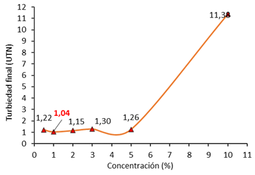 Determinación de la concentración óptima del sulfato de aluminio: Se observó que de las seis concentraciones preparadas la óptima fue al 1% con una turbiedad final de 1,04 UNT (Fig. 4) y pH 6,94, se hace mención también, que la concentración preparada al 10% que viene a ser la solución patrón (Apéndice digital, TABLA 2), registró una turbidez final de 11,38 UNT con pH 5,14, cuyo resultado se encuentra fuera del Límite Máximo Permisible D.S. 031-2010-SA-MINSA.