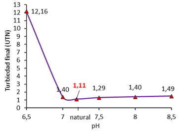 Determinación del pH óptimo del sulfato de aluminio: Con los valores de dosis y concentración se procedió a evaluar diferentes pH para encontrar su óptimo valor (Fig. 5), siendo el más eficiente el pH natural del agua, reportando una turbidez final de 1,11 UNT (Apéndice digital, TABLA 3).