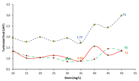 Turbidez final (UNT) del tratamiento 1, tratamiento 2 y tratamiento 3