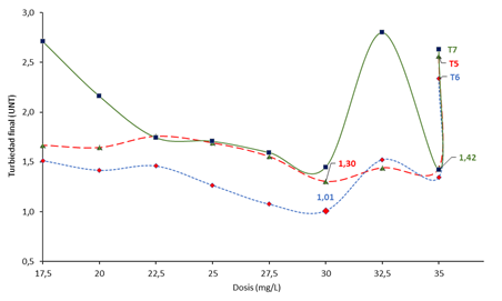 Turbidez final (UNT) del tratamiento 5, tratamiento 6 y tratamiento 7