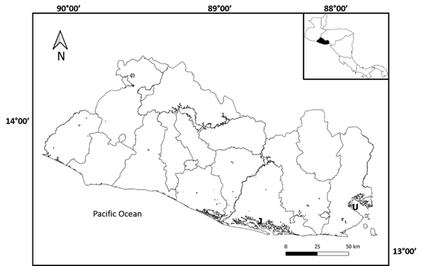Fig. 1. Sampling áreas in El Salvador: Puerto El Triunfo, Jiquilisco Bay (J) and Perico island at La Unión Bay (U).