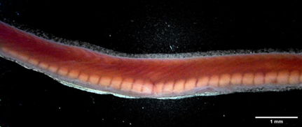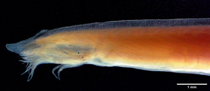 Description. Body white, elongate and thin. Presence of notochord. Rostral process evident on the anterior zone. Oral area with segmented cirri (30-39). Rostral, dorsal, and ventral fins present. Gonad pouches in the ventral region (26-31). Caudal fin as extension of the latter two. Whitish fins (Figures 4, 5 and 6, Specimen 40 -1095 MUHNES).