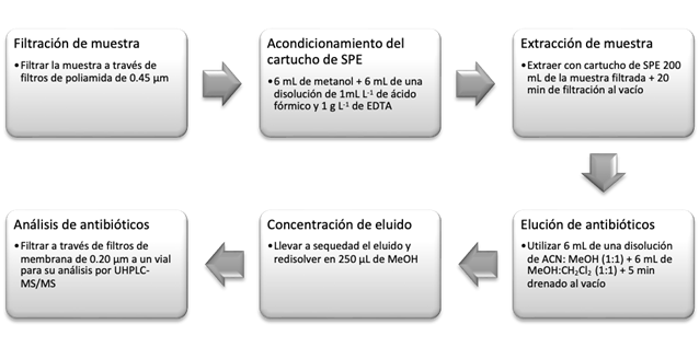 Validamos el método para cuatro antibióticos, tres tetraciclinas (tetraciclina, doxiciclina y oxitetraciclina) y un betalactámico (cefotaxima), considerando parámetros de desempeño de linealidad, límites de detección y cuantificación, precisión, recuperación y efecto de matriz; Tabla S1). Extracción y el análisis cromatográfico según Ramírez-Morales et al., 2020, y Zhang et al., 2016. Para los antibióticos usamos fase sólida, con un cartucho Oasis HLB 200mg (Waters, USA) y como disolventes de elución volúmenes iguales de metanol:acetonitrilo y metanol:diclorometano en proporciones 1:1 (Figura S1).