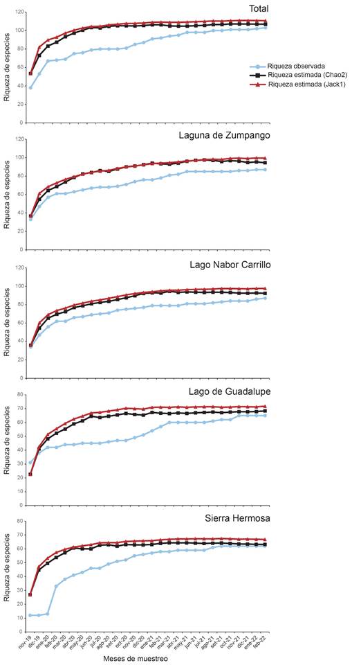 Riqueza de especies observada y estimada en los sitios de muestreo en la Zona Metropolitana de la Ciudad de México, México.