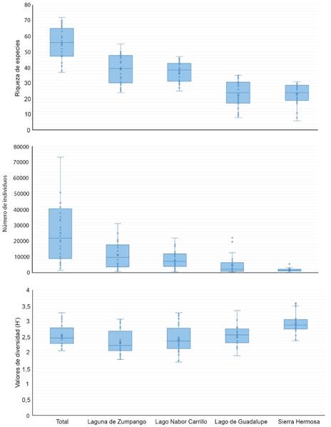 Fig. 3. Variación temporal de la riqueza de especies, abundancia (número de individuos) y diversidad (H´) en los sitios de muestreo en la Zona Metropolitana de la Ciudad de México, México.