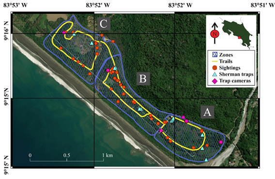 This study was carried out between the 18 and 21 of July of 2019 at the Hacienda Barú National Wildlife Refuge (from here on as Hacienda Barú), located in Puntarenas, Costa Rica. The refuge covers 330 hectares of protected area and is composed of primary and a secondary forest, approximately three kilometers of beach, plus another kilometer that borders the Barú river. With a mean temperature is 28,5°C and ~ 15m of maximum height, Hacienda Barú is part of a tropical wet forest based on the Holdridge life zones (Holdridge, 1978; The Weather Channel, 2023). We focused on the secondary forest and classified it in three different zones based on the characteristics and accessibility to the public. These were called Zone A: with access restricted to authorized personnel and dense forest; Zone B: with access to tourism and a mixture of dense forest with large grass patches; and Zone C: with access to tourists, human modified land use and forest with the vast majority in recovery. Each zone has walking trails established by Hacienda Barú (Fig. 1).