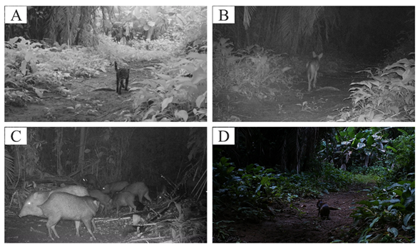 Fig. 3. Camera traps: Leopardus pardalis (A), Canis latrans (B), Pecari tajacu (C), and Dasyprocta punctata (D).