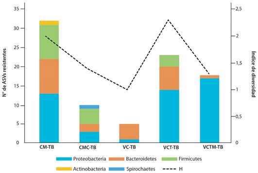 Además, se detectó un representante de Actinobacterias (Bifidobacterium) en CM-TB y uno de Spirochaetes (Treponema) en CMC-TB (Fig. 1).