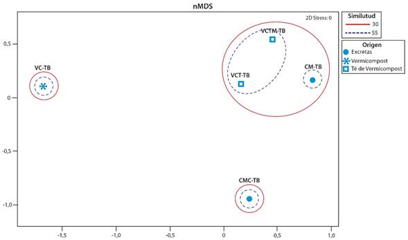 Géneros bacterianos: Identificamos 32 géneros bacterianos (Tabla 2): 19 de ellos en la muestra de excretas frescas; los géneros fueron Bifidobacterium, Bacteroides, Succinivibrio, Alloprevotella, Faecalibacter, Streptococcus, Paeniclostridium, Turicibacter, Phascolarctobacterium, Succinivibrio, Citrobacter, y miembros no clasificados de Bacteroidaceae y Bacteroidales en los caldos suplementados con oxitetraciclina. La mayoría de estos géneros fueron exclusivos en CM-TB, y tuvieron solamente un representante en bajo número de secuencias (Tabla 1). Por su parte Aeromonas, Acinetobacter, Clostridium, Escherichia-Shigella y Proteus, se encontraron tanto en las excretas como en los tés de vermicompost. Escherichia ASV-2143 y A. colistiniresistens ASV-2213 se encontraron en mayor abundancia en CM-TB, además de Kurthia massiliensis ASV-830 (Tabla 1).