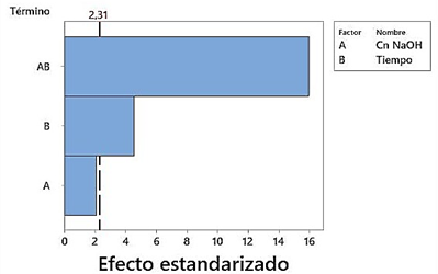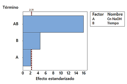 Según el análisis de varianza, tanto el tiempo de reacción, como la interacción entre la concentración de NaOH (factor “A”) y el tiempo de degradación (factor “B”) interfieren de forma significativa en la remoción de lignina de las fibras de piña. En el diagrama de Pareto, tanto la interacción como el factor “B” sobrepasan el límite de significancia (Fig. 1).