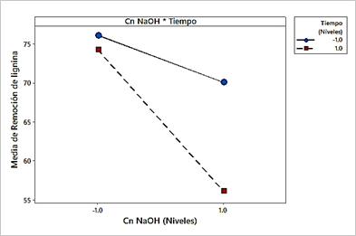 El mayor porcentaje de remoción de lignina se da en el nivel bajo de ambos factores (Fig. 4): de las cuatro combinaciones de factores, las condiciones más bajas de tiempo y concentración de NaOH presentan la mayor eliminación de lignina.