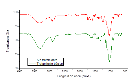 El pico alrededor de los 3300cm-1 es un estiramiento asociado con la vibración del enlace de hidrógeno de los grupos hidroxilo en holocelulosa, así como el pico a 1000cm-1 característico del enlace simple C-O, vibración de estiramiento que pertenece a los polisacáridos en la celulosa: en rojo los espectros de las biomasas sin tratamiento, en verde b fibras con tratamiento básico (Figuras 7 y 8).